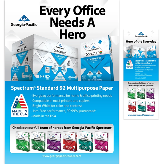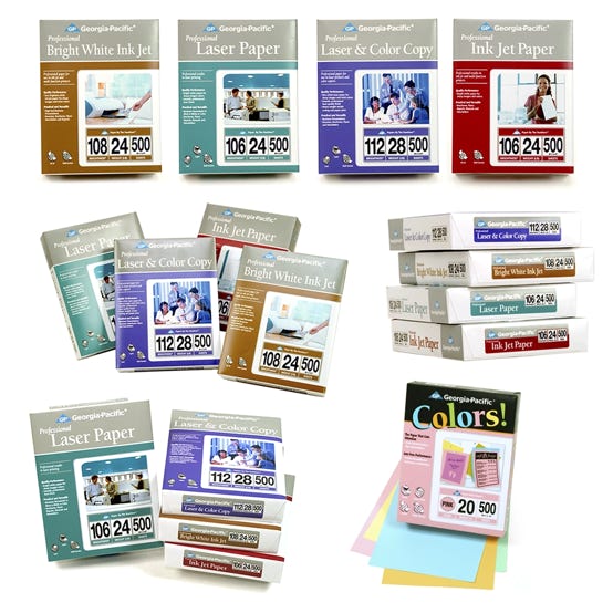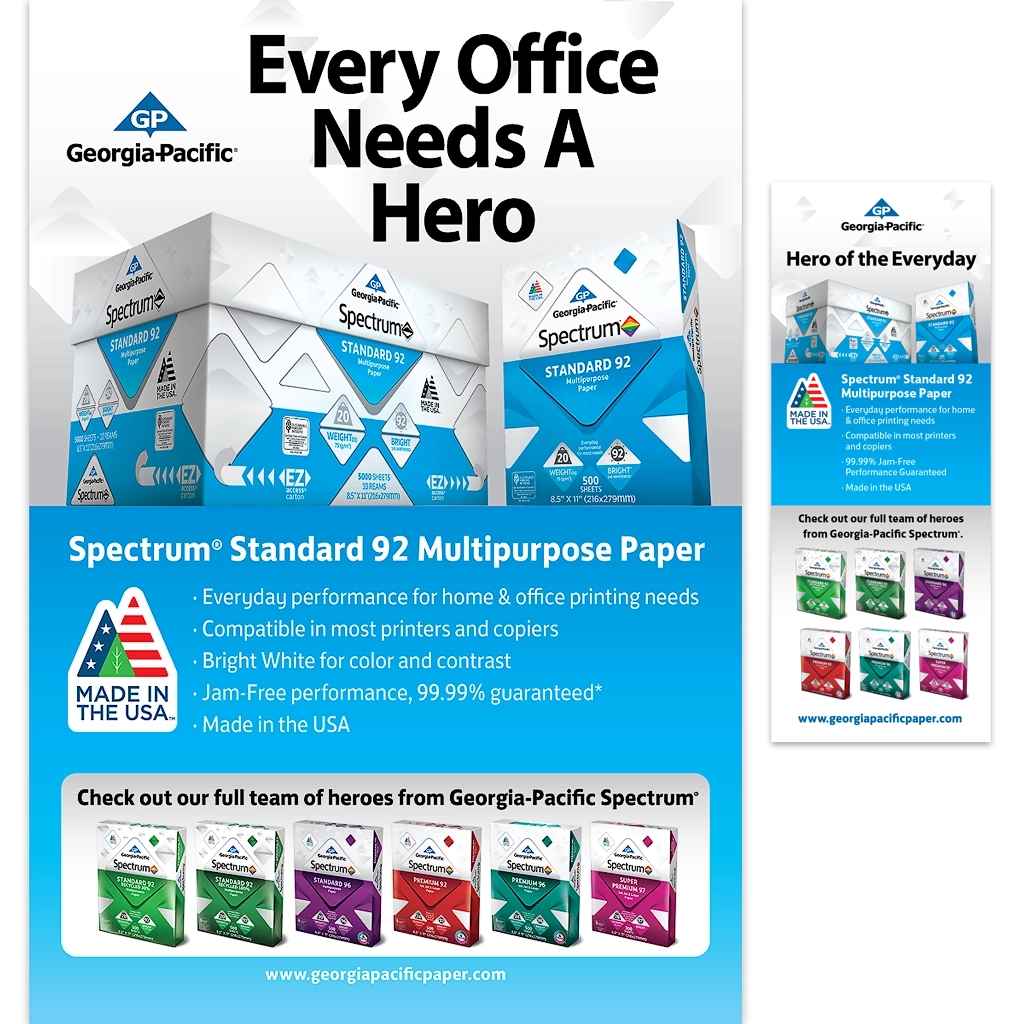 Design a Georgia-Pacific Office Papers tradeshow package that includes product photography, brochure, product sheets, and a tabletop display designed to portray the products as part of a productive and fun work environment. Create a brand-aligned marketing toolset for representatives and an engaging, informative environment for attendees. Build physical paper ream mockups, shoot product photography, and build a media asset library for marketing.