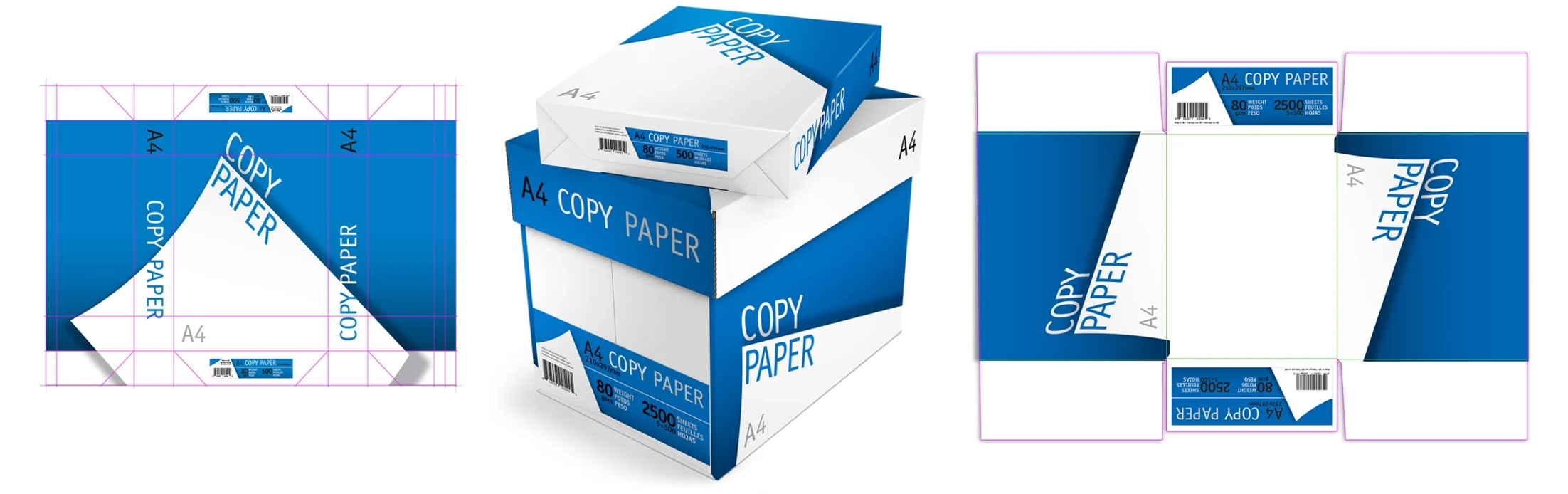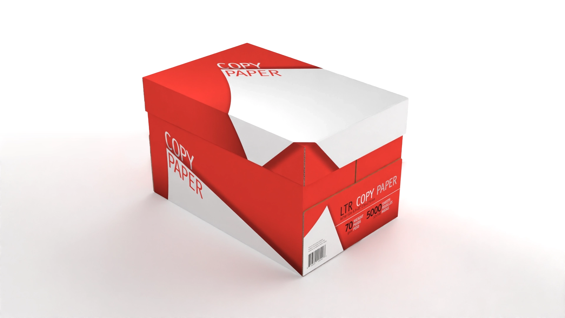 A simple geometric white shape was laid against a contrasting color background for immediate recognition, while curves to the shape, perspective to type, and shadow tones were added for dimension to signify sophistication, presenting a quality product that will operate in machines reliably without failure. Build die-lines per vendor specifications. Two color limit for reduced production costs (black with a second color signifying paper thickness.) Deploy graphics across three products and two sizes, meeting U.S. and European labeling standards. Create 3D renders for marketing.