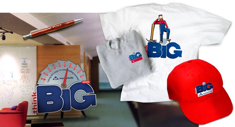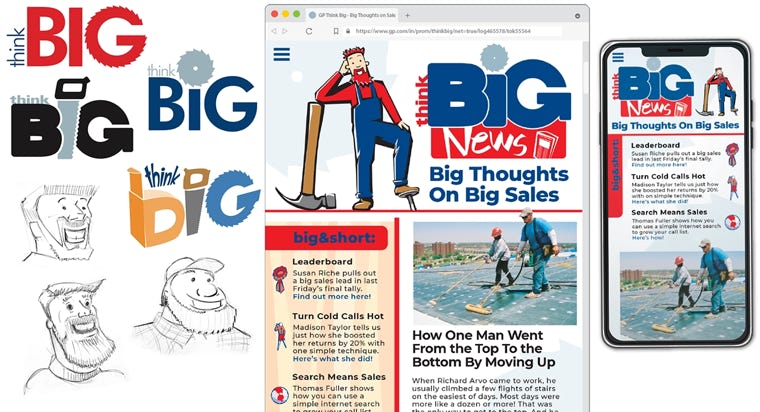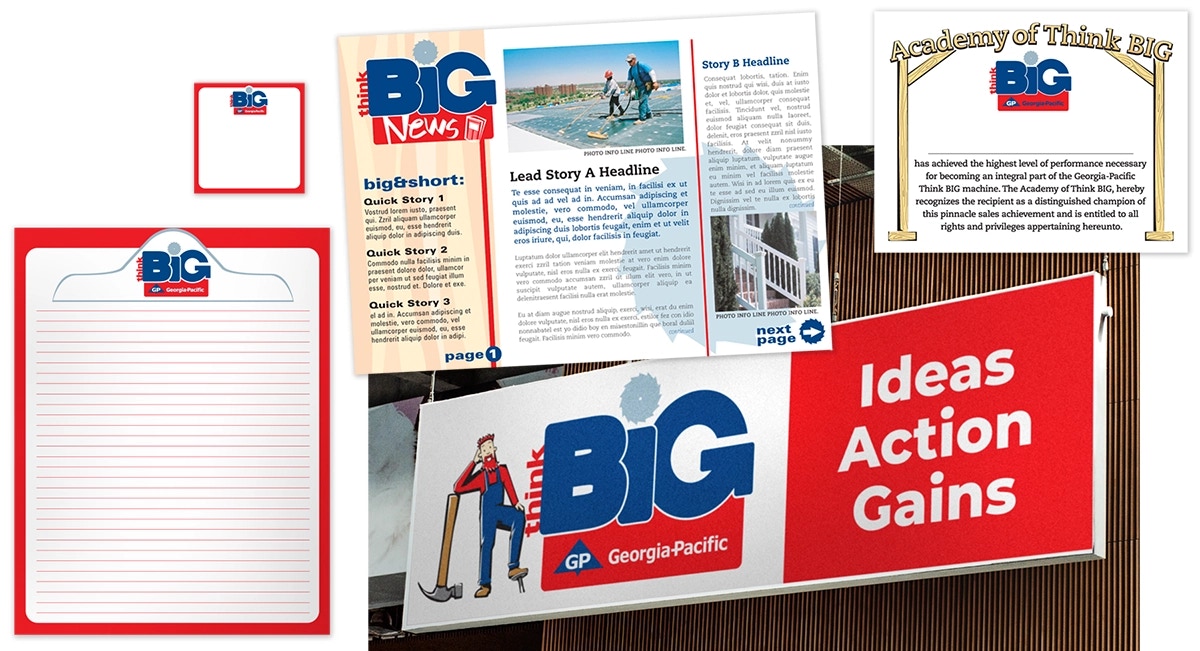 An incentivized program that delivers the sales performance push as a fun and engaging experience. Utilize industry-related iconography, brand colors, merchandise, and a thinkBIG character to connect with participants, providing a cohesive experience and maximizing participation. Signage, responsive website newsletter, logo and character design, newsletter template, merchandise: apparel, notepads, pens, sticky notes.