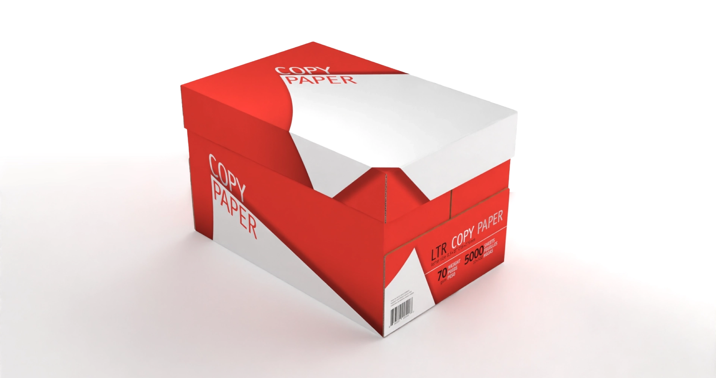 A simple geometric white shape was laid against a contrasting color background for immediate recognition, while curves to the shape, perspective to type, and shadow tones were added for dimension to signify sophistication, presenting a quality product that will operate in machines reliably without failure. Build die-lines per vendor specifications. Two color limit for reduced production costs (black with a second color signifying paper thickness.) Deploy graphics across three products and two sizes, meeting U.S. and European labeling standards. Create 3D renders for marketing.