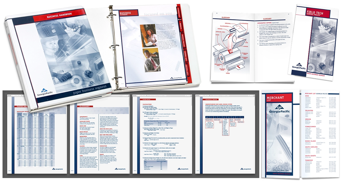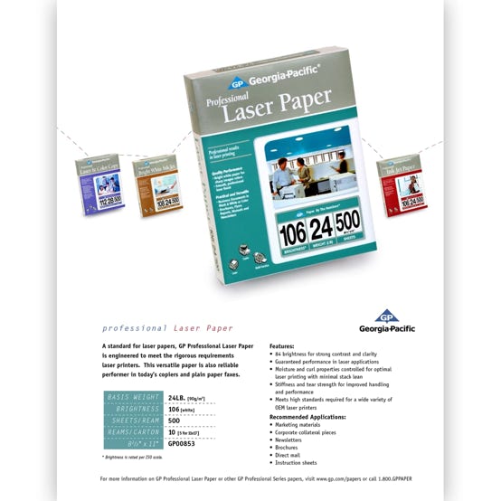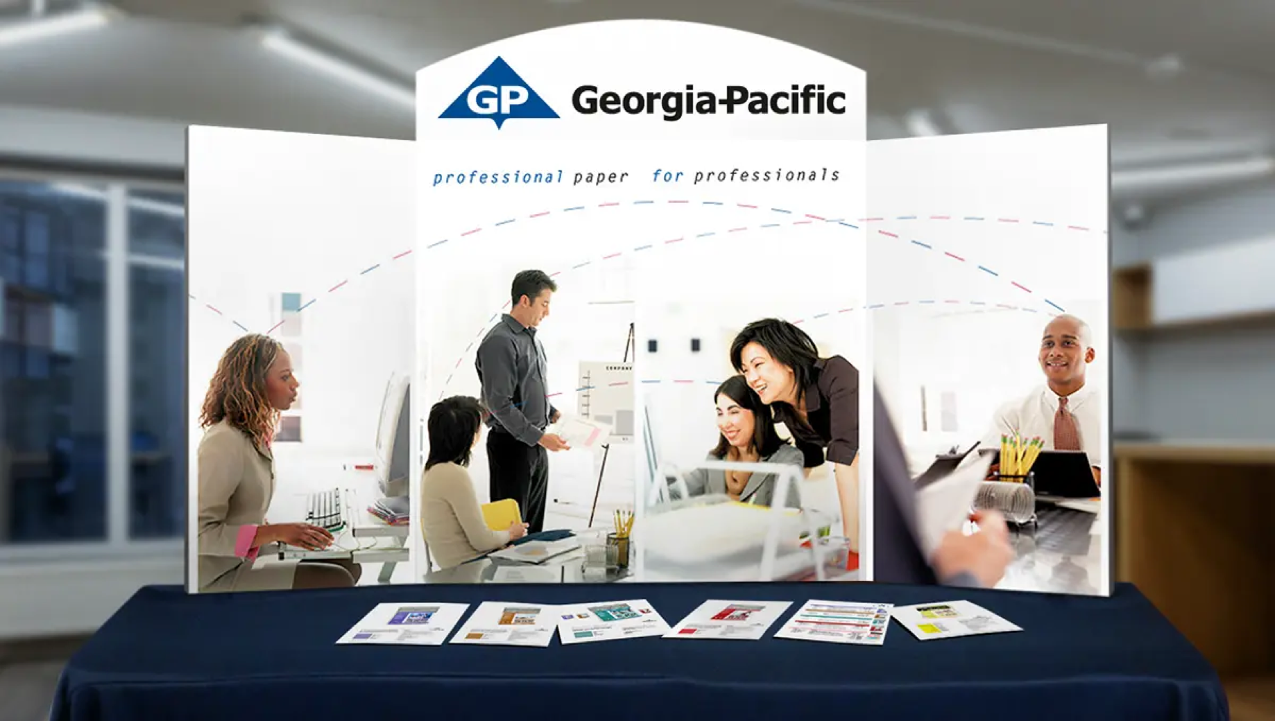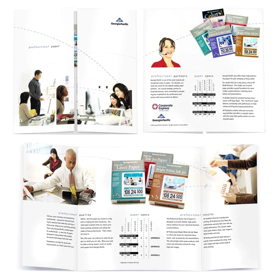 Design a Georgia-Pacific Office Papers tradeshow package that includes product photography, brochure, product sheets, and a tabletop display designed to portray the products as part of a productive and fun work environment. Create a brand-aligned marketing toolset for representatives and an engaging, informative environment for attendees. Build physical paper ream mockups, shoot product photography, and build a media asset library for marketing.