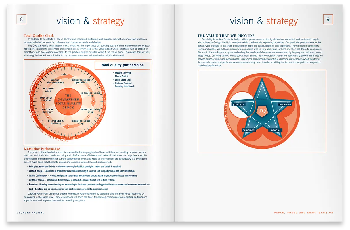 A two-color reference handbook for rapid, division-wide deployment in print and digital formats as an animated e-book and website asset. Interpret the plan’s concepts into informational graphics detailing components and processes for maximum comprehension and engagement. Design and illustration.